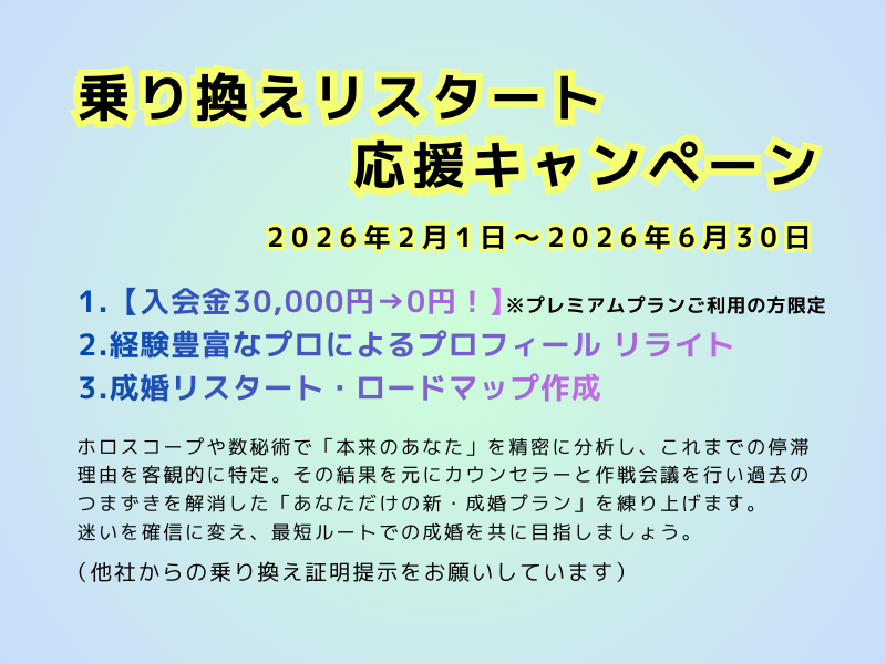 当相談所では、乗り換えを検討されている方限定で、プレミアムプラン入会金0円の「リスタート応援キャンペーン」を実施中です。※詳細はカウンセラーにお問い合わせください。